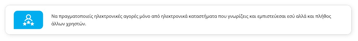 Σου παραθέτουμε μερικές χρήσιμες συμβουλές για ασφαλείς ηλεκτρονικές αγορές, ώστε να αποφύγεις μία πιθανή ηλεκτρονική απάτη: