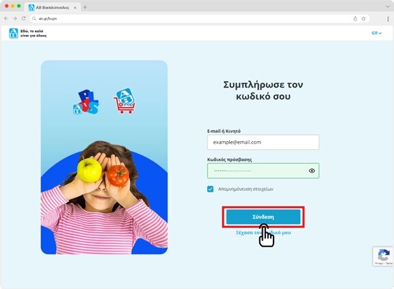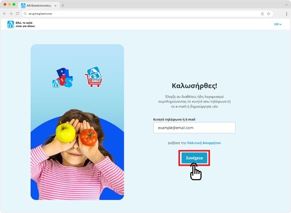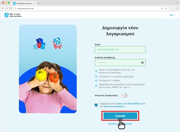 Για την εγγραφή λογαριασμού πάτησε το κουμπί 'Σύνδεση ή εγγραφή" από την αρχική σελίδα του AB Eshop