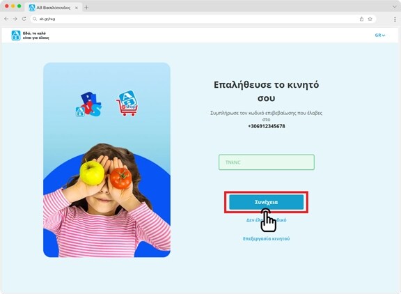 Στο κινητό που συμπλήρωσες θα σου έρθει ένα μήνυμα κωδικού μίας χρήσης για να κάνεις επαλήθευση του αριθμού σου. Συμπλήρωσε τον και πάτησε "Συνέχεια"