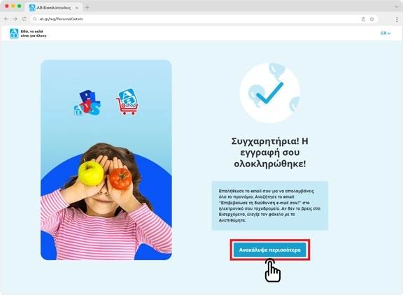 Ολοκλήρωσες την εγγραφή σου! Θα σου έρθει μια επαλήθευση στο email σου. Μπορείς να πλοηγηθείς στον κόσμο του ΑΒ πατώντας το "Ανακάλυψε περισσότερα"