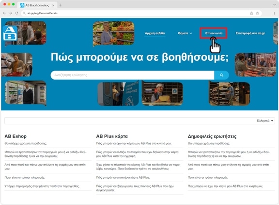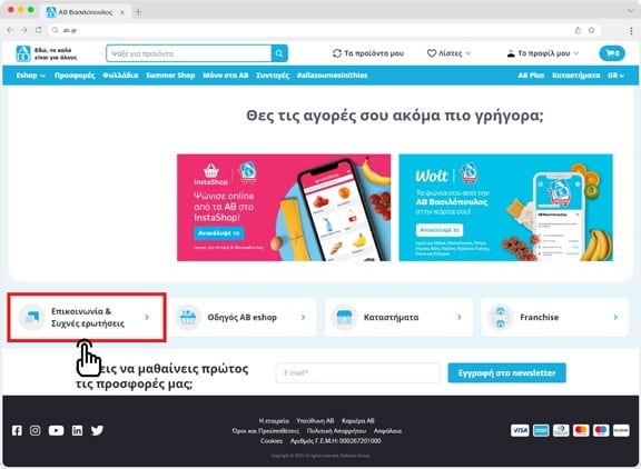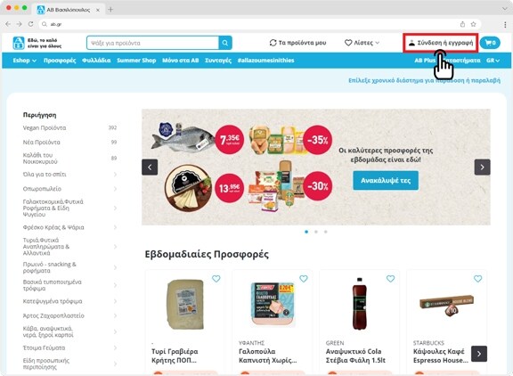 Για την σύνδεση λογαριασμού πάτησε το κουμπί 'Σύνδεση ή εγγραφή" από την αρχική σελίδα του AB Eshop