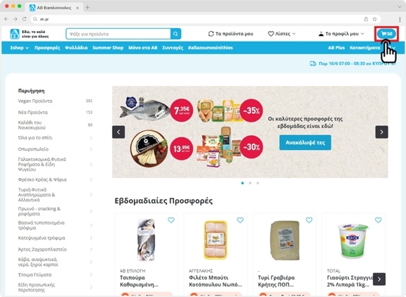 Αφού κάνεις σύνδεση, επιλέξεις διεύθυνση, διάστημα παράδοσης και κάνεις τις αγορές σου, πάτησε να δεις το καλάθι σου