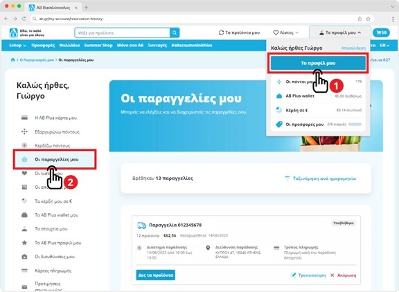 Για να τροποποιήσεις ή ακυρώσεις μία παραγγελία, πρέπει να μεταβείς στην ενότητα "Το προφίλ μου" (1) και να επιλέξεις "Οι παραγγελίες μου" (2)