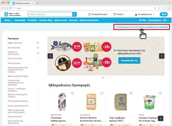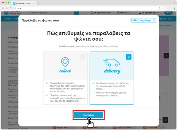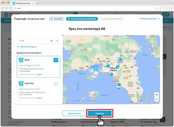 Σε περίπτωση επιλογής παραλαβής των αγορών σου από εσένα, θα χρειαστεί να αναζητήσεις το ιδανικό κατάστημα ΑΒ για την παραλαβή, και μετά την ημέρα & ώρα παραλαβής.