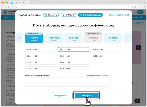 Εδώ θα επιλέξεις την ημέρα και διάστημα ωρών για την παράδοση των αγορών σου στην διεύθυνση που δήλωσες, καθώς και να προσθέσεις πιθανές παρατηρήσεις για τον οδηγό μας. Μπορείς να συνεχίσεις τις αγορές σου!