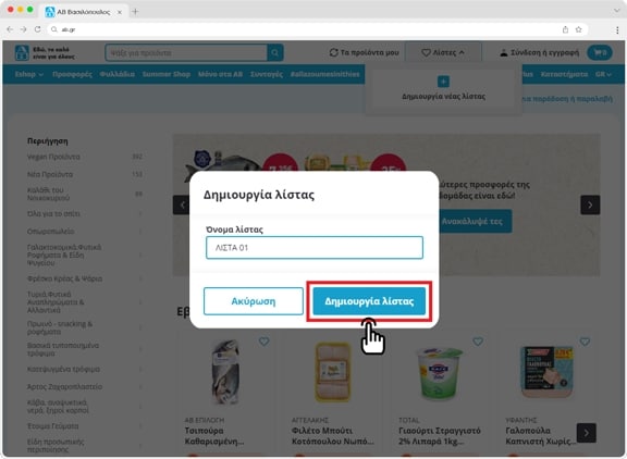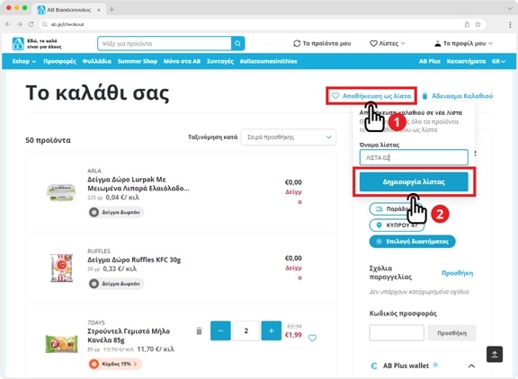 Μπορείς να δημιουργήσεις μια νέα λίστα με όλα τα προϊόντα που έχεις στο καλάθι σου. Πάτησε το "Αποθήκευση ως λίστα" (1) και αφού συμπληρώσεις το όνομα επίλεξε "Δημιουργία λίστας" (2)