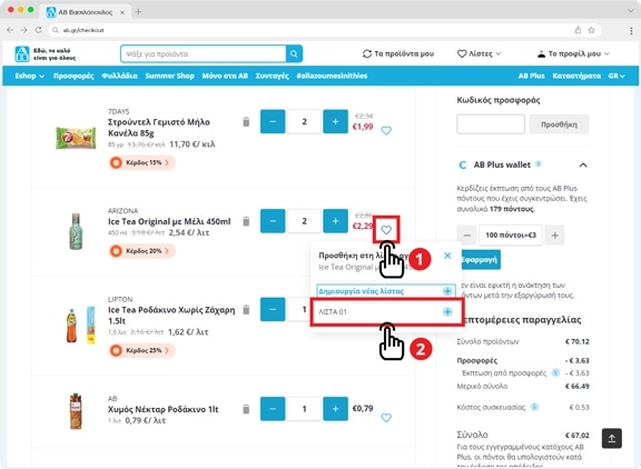 Μπορείς να προσθέσεις προϊόντα που έχεις στο καλάθι (1) στην λίστα σου (2)