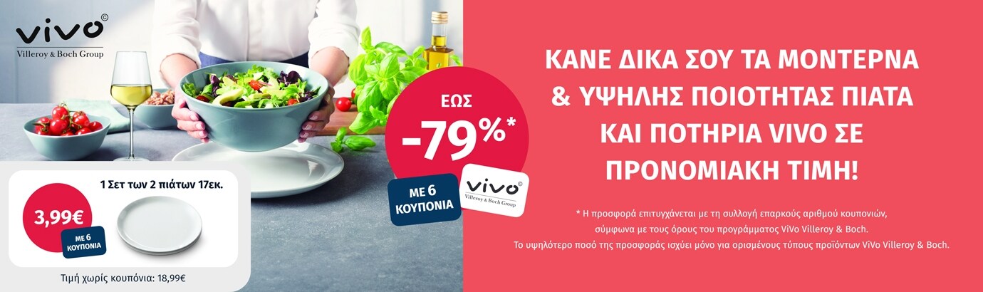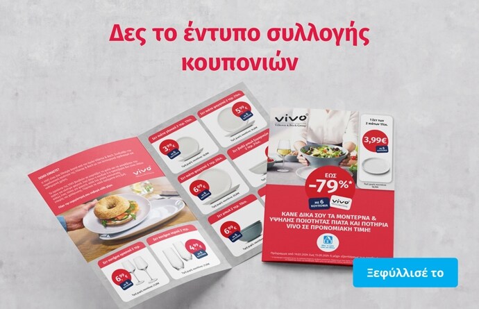 • Μόλις συγκεντρώσεις 6 κουπόνια, μπορείς να επωφεληθείς από τη μεγάλη προσφορά και να αποκτήσεις ένα από αυτά τα μοναδικά πιάτα και ποτήρια VIVO που θα βρεις στο stand του καταστήματος, σε προνομιακή τιμή ή να τα εξαργυρώσεις στο AB App και να παραλάβεις τα προϊόντα μαζί με την παραγγελία σου από το AB Eshop.