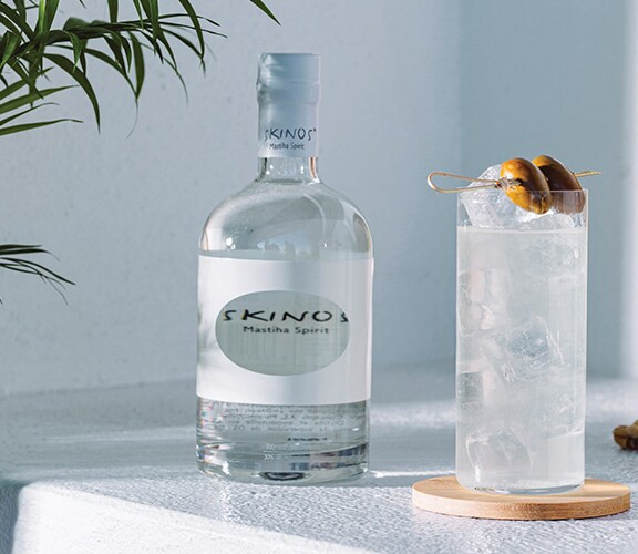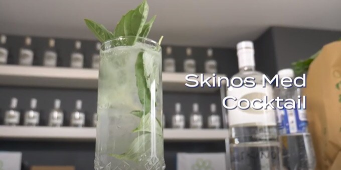 - Προσθέτουμε στο ποτήρι τον βασιλικό, τη ζάχαρη, τον χυμό λεμονιού και τη Skinos Mastiha Spirit.